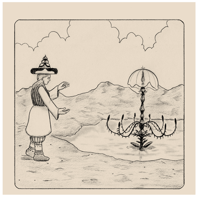 Follow Corinne Jitan as she explores the fantastic landscape of Mak Patar, the mysterious holy mountain of her people. This wordless comic, drawn in lush pencil, is an excerpt of a longer journey from Ignatz-nominated cartoonist Kevin Reilly.